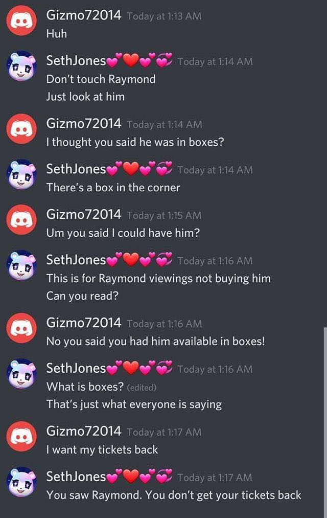 hab eben ein video gesehen wo einer in nen discord server raymond zum verkauf angeboten hat und 2 sek danach ist sein discord abgestürzt von den ganzen pns